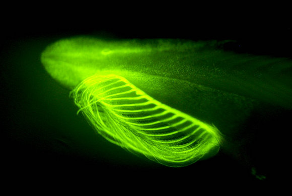 发出明亮绿色荧光的中国白氏文昌鱼头部和口笠