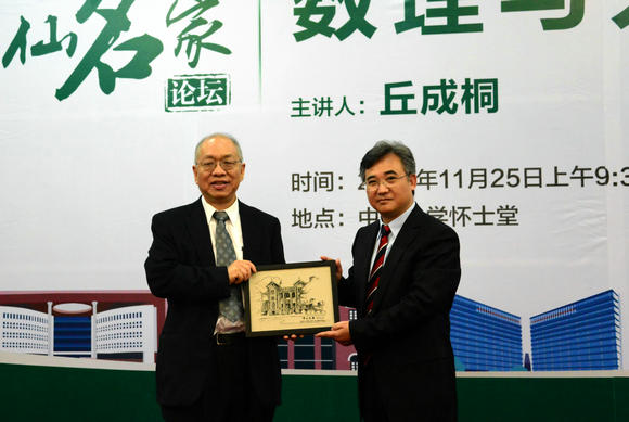 朱熹平(右)向丘成桐教授(左)赠送礼品