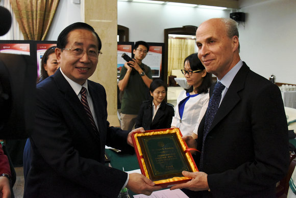 郑德涛书记为我校首届顾问董事Roger David Kornberg(罗杰·科恩伯格)先生颁发聘书