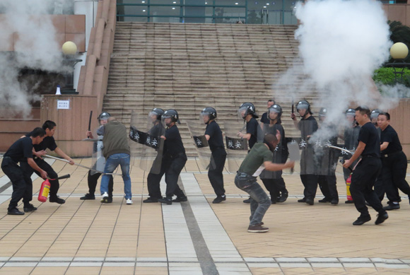 以提高学校安保人员的处突能力和防范技巧为目的,保卫处分别于11月7日下午在东校区图书馆前广场、11月10日下午在南校区梁銶琚堂前开展了校园突发事件应急处置演练。演练队伍由保卫处、超算中心校卫队员组成,模拟针对不法分子实施人身侵害行为和对校园活动场所实施破坏行为予以阻截、制服演练。学校安保人员、物业公司保安等观摩了演练,同时演练还吸引了经过的师生旁观。