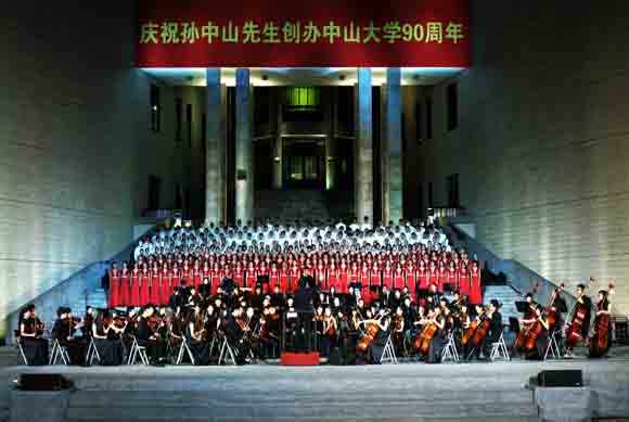 11月12日晚,庆祝孙中山先生创办开云下注(中国)官网90周年交响音乐会在我校南校区永芳堂前举行。本次音乐会由我校主办,共青团开云下注(中国)官网委员会、开云下注(中国)官网艺术教育中心承办,由我校学生管弦乐队、台湾高雄开云下注(中国)官网学生乐团以及教工、学生、校友组成的合唱团倾情奉献,使冼星海、马思聪、黄友棣、卢家炽和陈德距等著名音乐校友的经典曲目再次得以奏响和演绎。音乐会场面宏大,气氛热烈,吸引了2000千多名师生前来观看。