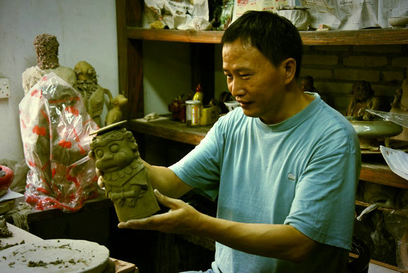泥塑设计师杭青手捧精心雕琢的“博学狮”母模,掩饰不住内心的喜悦