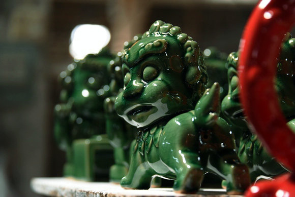 施好釉的“笃行狮”通体呈桃红色,经过近一天的烧制,釉彩便会窑变为光亮的大唐红
