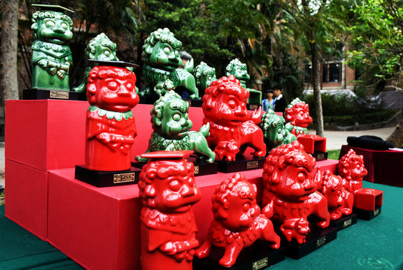发布会上播放了吉祥物专题介绍片。五只形态各异的中大狮分别以校训中的“博学、审问、慎思、明辨、笃行”来命名,形态可掬,或天马行空、或闭幕静思、或广闻博识、或执礼学成,与马丁堂前的石狮隔空相望,相映成趣。中大狮由陶塑铸成,配上“大唐红”和清透有冰裂纹的碧绿颜色,恰好与中大代表性的红砖绿瓦呼应,相得益彰。