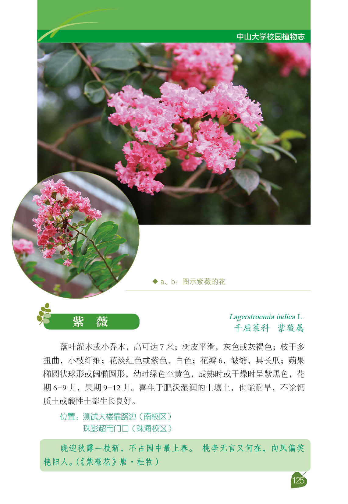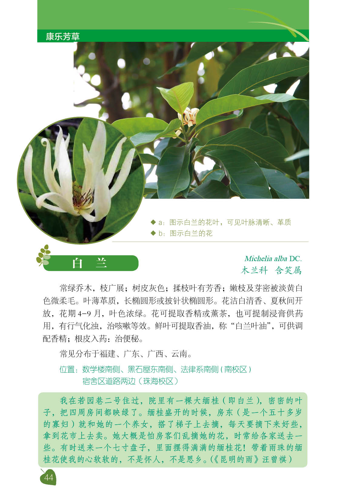 看着这些校园草木的图谱,不由得又勾起30多年前的另一段往事。77级大学生是1978年春天入学的,入学次年适逢建国后第一个植树节,全体学生都参加了植树活动。今日南校区东门大路遮天蔽日的那两排大叶榕,就是我们这个年级种的。许宁生、李萍、朱熹平、许跃生、吴承学等等师长,1979年3月12日那个微雨的下午,应该都在康乐园里挥锄植树的学生人群之中。30多年过去,人在成长,木亦成林。我们这代人自以为多一些理想主义情怀,其实年轻时代仍免不了偶有“附庸风雅”的举动。当年校园里“文学青年”为数不少,民间也自发遴选过所谓“校园八景”,是为紫荆迎宾、绿草如茵、画楼燕舞、惺亭夜月、马岗松涛、东湖夕望、江山一览和先哲风范。将“先哲风范”列入“八景”之中,反映了那一代青年的敢想与无畏,却也折射出校园与花园的不同。“紫荆迎宾”、“绿草如茵”和“马岗松涛”均是以草木入景,可知康乐园植物群落的魅力感人至深。