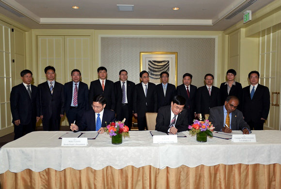 我校校长许宁生、卡内基梅隆大学校长Subra Suresh、佛山市顺德区区长黄喜忠签署合作谅解备忘录,广东省省长朱小丹见证