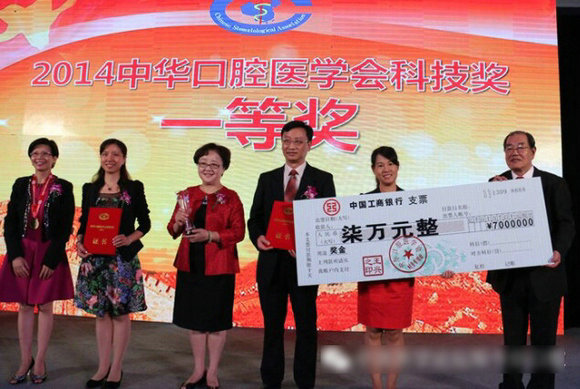 颁奖大会由中华口腔医学会副会长张志愿教授主持。凌均棨、韦曦、林正梅、古丽莎等团队成员上台领奖,中华口腔医学会会长王兴教授致辞并颁奖。附属口腔医院程斌常务副院长出席颁奖大会。