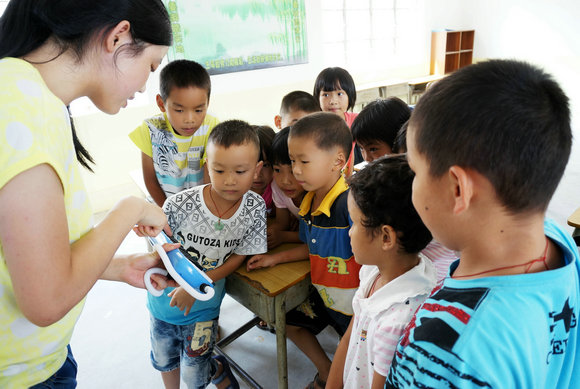 志愿者为孩子们讲解口风琴的使用