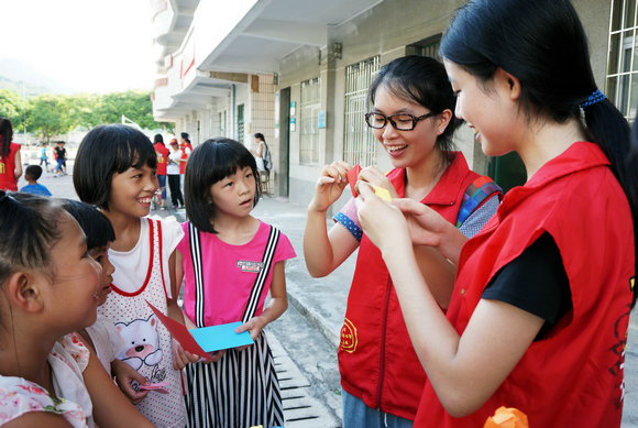 志愿者教孩子们折玫瑰花
