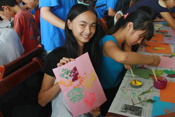 我校“三下乡”同学与揭阳览表学校学生共同进行树叶拓印活动