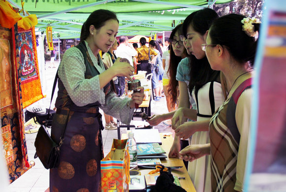 西藏民族学院交换生向参与者介绍藏族物品