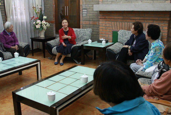 校党委副书记、校友总会常务副会长李萍在黑石屋接待了黄美清女士一行