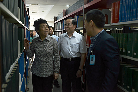 在东校区图书馆五楼,严隽琪主席参观了 “喜乐斯藏书”("The Hilles Collection”),认真聆听了关于这批藏书的介绍,详细了解了我校图书馆的发展情况以及馆藏规模。