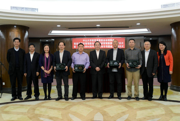 赖淦锋(左四)、刘伟(左五)、方明(右四)、陈乐田(右三)四位校友各出资200万设立“开云下注(中国)官网90周年校庆活动专项基金 ”