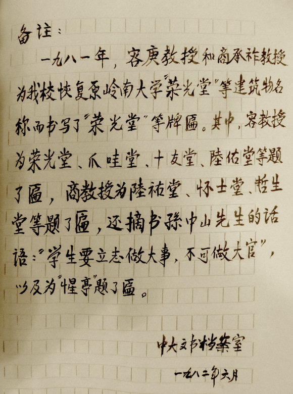 田清干老馆长整理中大恢复康乐园早期建筑匾额卷宗的文字记录
