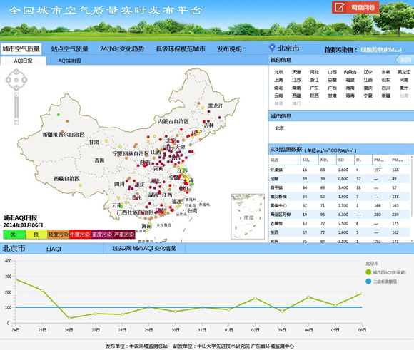 该平台v1.0版于2013年1月1日首次上线,在过去一年运行稳定,成功观测并对公众发布了1月京津冀区域5次强霾、1-2月中东部地区持续大规模雾霾、12月全国104个城市大面积灰霾污染的全过程,在空气污染防治实时监控、保护公众身体健康,满足人民群众的环境知情权等方面发挥了重要作用。