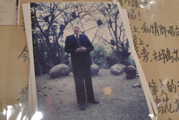 黄友棣先生生前照片,背景是其《杜鹃花》曲词(皆翻拍自许伯夷先生所捐赠资料)