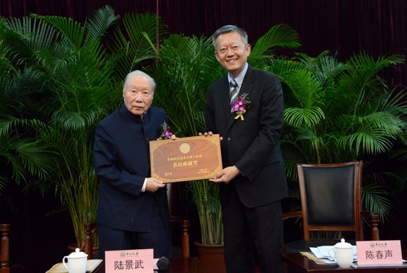 11月12日,正值我校创办89周年校庆之日,陆景武教授“卓越校友杰出成就奖”颁奖暨文物捐赠仪式在南校区怀士堂举行。校党委常务副书记、副校长陈春声,副书记李萍,图书馆馆长程焕文,校长办公室主任陈望南,管理学院执行院长李仲飞,陆景武教授家乡广东茂名市、信宜市有关领导以及陆教授的亲友,学校相关部门、院系的师生代表等参加了仪式。仪式由李萍副书记主持。
