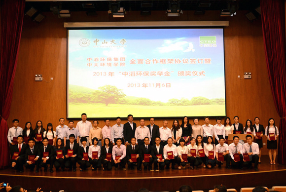 11月6日下午,我校环境科学与工程学院与中滔环保集团全面合作框架协议签订暨2013年“中滔环保奖学金”颁奖仪式在东校区顺利举行。校党委副书记、副校长朱孔军,中滔环保集团有限公司执行董事、总经理卢已立,广州滔记实业发展集团有限公司总经理杜道洪,中滔环保集团有限公司办公室主任姚兆俊,中滔环保集团有限公司董事长秘书周文峰以及环境学院院长仇荣亮教授等校内外领导、嘉宾应邀出席了本次颁奖仪式。环境学院300多名师生参加了仪式。