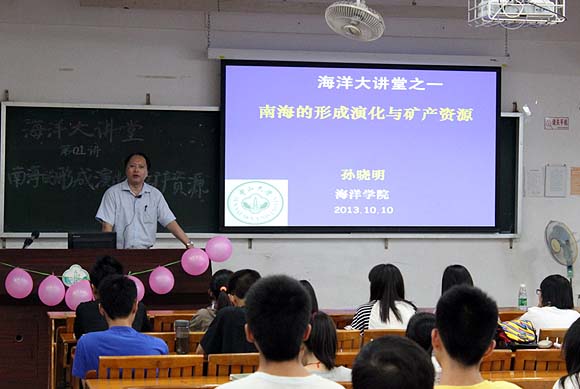 10月10日晚,由海洋学院举办的海洋大讲堂2013年第一讲在珠海校区教学楼举行,讲座题目为“南海的形成演化与矿产资源”,主讲嘉宾为孙晓明教授。