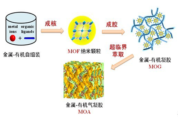 近年来,采用晶体工程方法创造金属-有机框架(MOF)微孔材料成为国际前沿热点领域,由于其兼备了金属的多功能性和有机化合物的分子设计性,因而便于自组装结构丰富、孔道规则、框架可调的长程有序晶态材料。为解决常规晶态MOF材料孔径较小(< 2 nm)、加工成型较难等工业化应用问题,苏成勇教授、张建勇副教授与合作者经过大量实验和系统探索,提出了一种溶胶-凝胶法分步合成金属-有机气凝胶(moa)的方法。他们首次将结构明确、孔径可调的mof纳米微孔基元引入长程无序的凝胶骨架,得到多级孔结构的金属-有机气凝胶。这类新型化合物兼具了普通气凝胶无序介孔和晶态mof规则微孔的优点,大大提高了金属-有机框架多孔材料的传质行为和结构调节能力,有关成果对加强气凝胶的结构分析、改性、功能化具有重要意义。同时,这种方法简单并有普适性,便于放大合成,有助于金属-有机框架多孔材料的宏量制备和工业化应用。