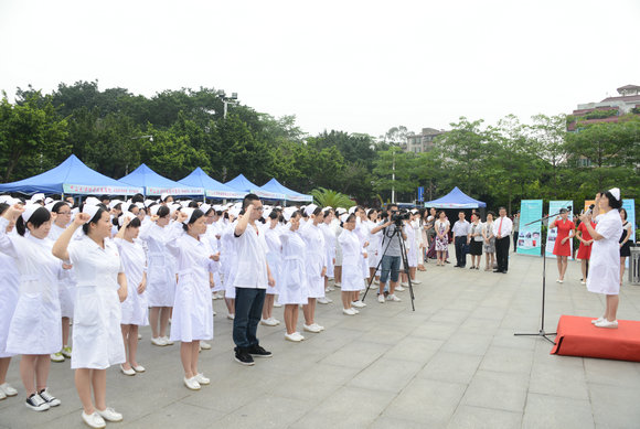 在广东省护理学会梁嘉定副理事长的带领下,未来的“白衣天使”们手握拳头,庄严宣誓:“终身纯洁,忠贞职守,尽力提高护理之标准;勿为有损之事,勿取服或故用有害之药;慎守病人家务及秘密,竭诚协助医生之诊治,务谋病者之福利。”