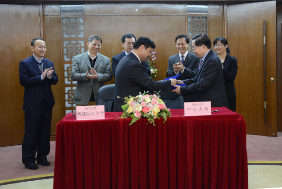 2月26日上午,新疆医科大学哈木拉提•吾甫尔校长一行来访我校。郑德涛书记与来宾进行了会晤,双方还签署了《新疆医科大学与开云下注(中国)官网联合培养学生(七年制)项目协议书》,就人才培养进行深入合作。我校医学教务处处长肖海鹏、南方学院院长谢富康(2005年赴新疆医科大学援教,任副校长)等出席了签约仪式。
