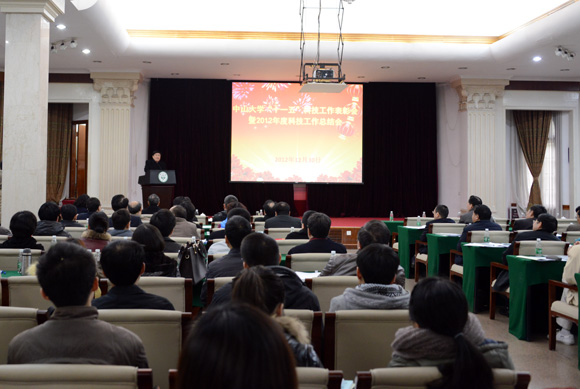 会议首先由夏亮辉校长助理宣读了学校“关于表彰‘十一五’科技工作先进单位和优秀科研团队的决定”,对“十一五”期间科技工作取得突出成绩的75个单位和团队予以表彰;接着生命学院束文圣教授和附属第一医院余学清教授分别代表科技工作先进单位和优秀科研团队发言;随后夏亮辉校长助理(兼科研院副院长)代表理工科、梁丹处长代表医科分别作了理工科、医科2012年度科技工作报告。