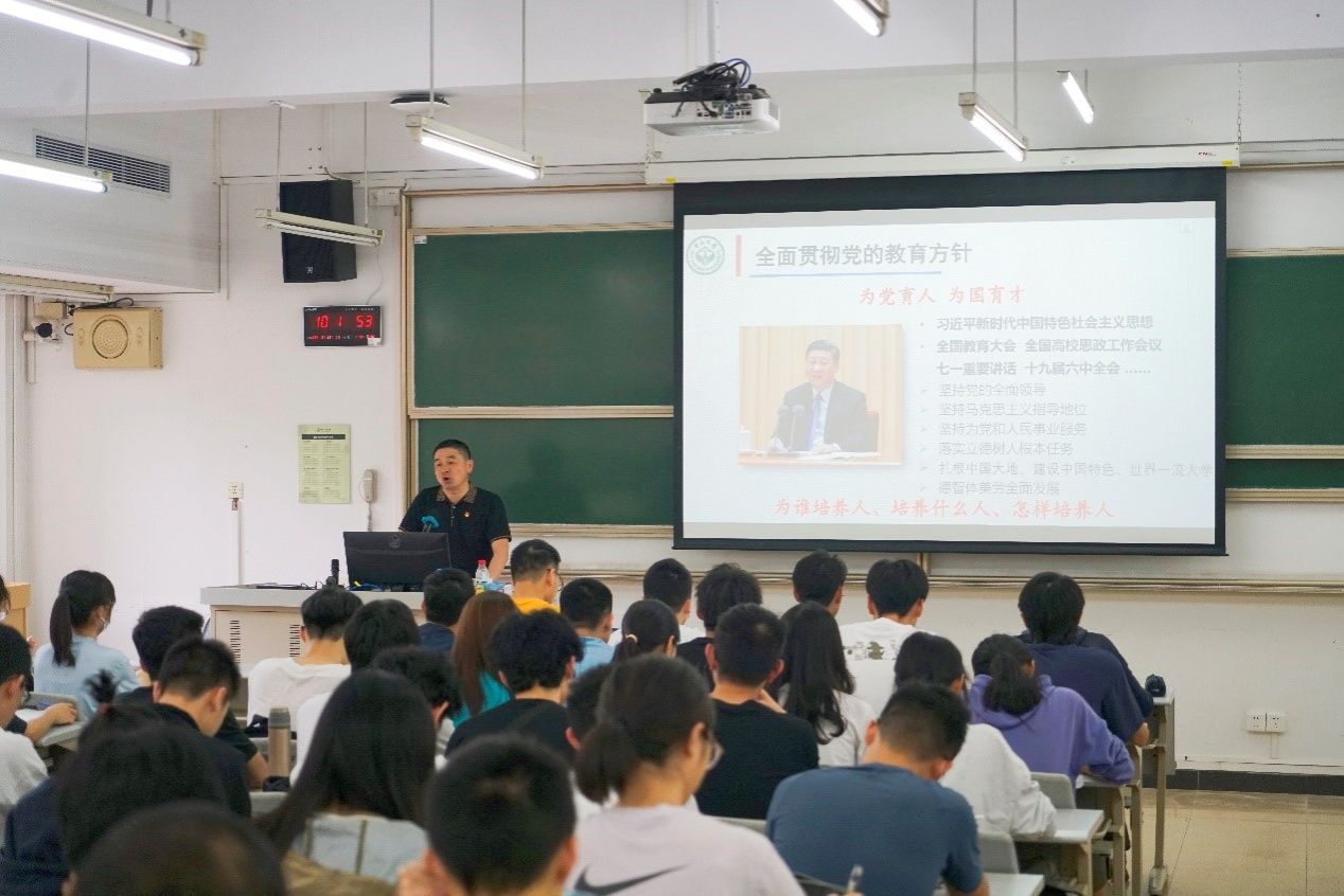 刘济科副校长向同学们讲授党的教育方针,要“为党育人、为国育才”。全面贯彻党的教育方针,就是要以习近平新时代中国特色社会主义思想为指导,贯彻党的十九大和十九届历次全会精神,贯彻落实习近平总书记关于教育的重要论述及全国教育大会精神,坚持党对教育事业的全面领导,坚持马克思主义指导地位,坚持为党和人民事业服务,坚持落实立德树人根本任务,扎根中国大地,建设中国特色、世界一流大学,培养德智体美劳全面发展的社会主义建设者和接班人。