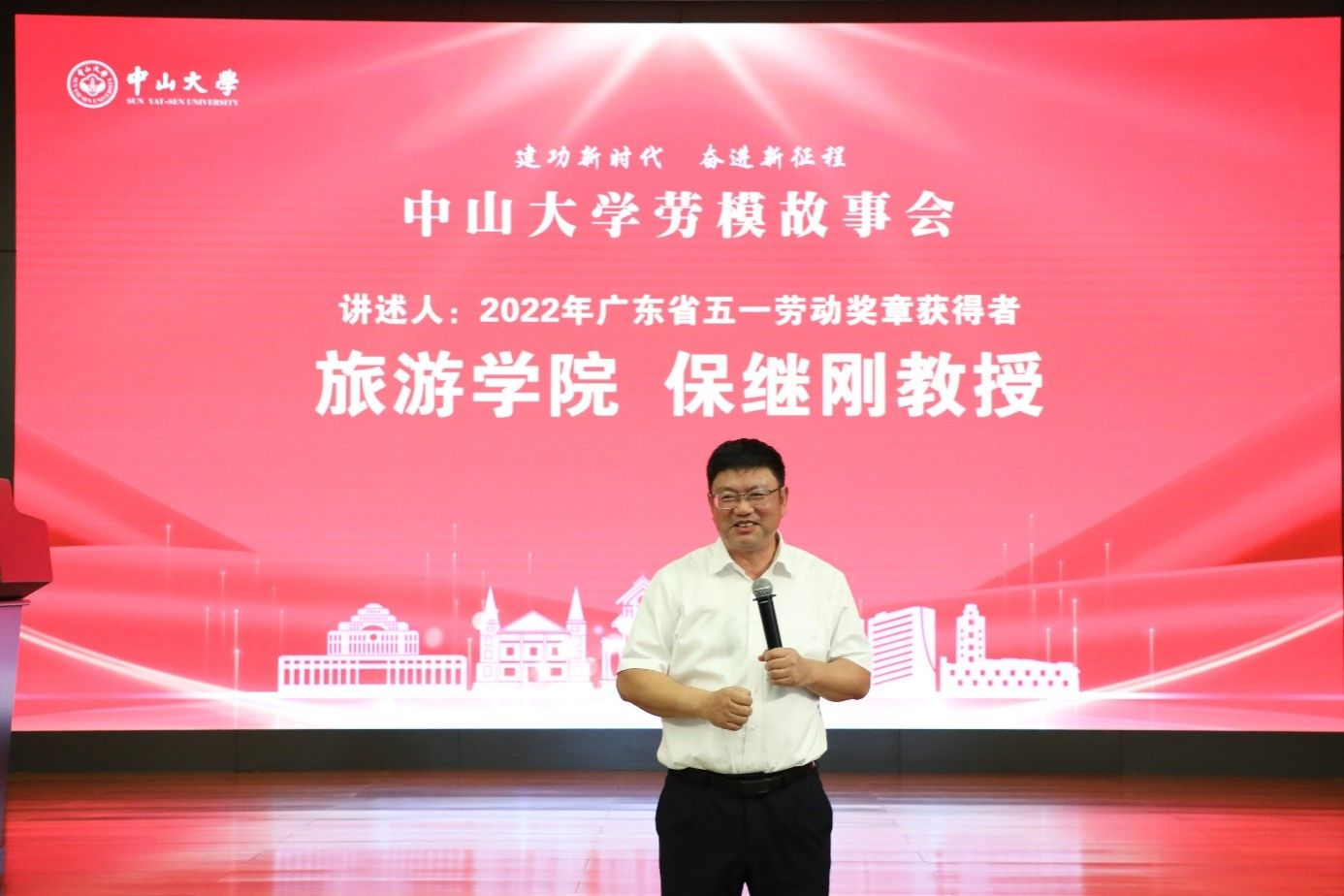 劳模故事会上,2022年广东省五一劳动奖章获得者旅游学院保继刚教授、2022年全国五一劳动奖章获得者孙逸仙纪念医院宋尔卫院士作为获奖代表分享了他们的故事。保继刚教授以“现实问题与学术问题:理论与实践的辩证关系”为主题,分享了自身从理论、实践到再理论、再实践的奋斗历程,重点介绍“阿者科计划”的探索及成效,同时建议学术研究者发展自身爱好,强健体魄。宋尔卫院士以“医学与艺术”为主题,通过文学、艺术等学科的生动例子,分享了他对人文关怀与医学发展紧密联系的思考。基于三十年的社区研究成果,保继刚教授运用学科优势,致力于旅游减贫,为脱贫攻坚接续乡村振兴做出重要贡献;宋尔卫教授面向人民生命健康,取得系列原创性学术成果,以实际行动深入践行健康帮扶,服务健康中国战略。他们的讲述让在场每一位听众都深深被打动。两位主讲人与在场听众进行了热烈的互动交流。