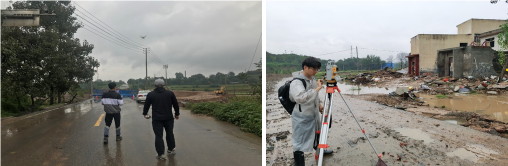 尽管是第一次参加这种重大调研任务,而且灾后现场状况也是险象环生,可团队里的研究生们有如“初生牛犊”,“明知山有虎偏向虎山行”,勇敢地挑起重担,成为了本次调查的生力军。在陈洋波教授指导下,朱彦峥同学在现场仔细调查洪水发生的详细状况,周峰同学在现场构建并核对流溪河模型结构,晚上返回营地后模拟灾区洪水过程。在刘凯副教授的指导下,刘智泉同学操作无人机在恶劣天气条件下测量灾区地形,谷雨同学在雨中操作全站仪测量洪痕高程;在杜国明副教授的指导下,孙怀张同学深入灾区测量特殊区域的滞洪水量及特征线,并绘制相关图线。在钟鸣副教授和黄英博士后的指导下,黄鑫同学深入水毁工程现场探查工程损毁情况及原因,许世超同学在洪灾现场勾画及测量洪水淹没范围及深度。