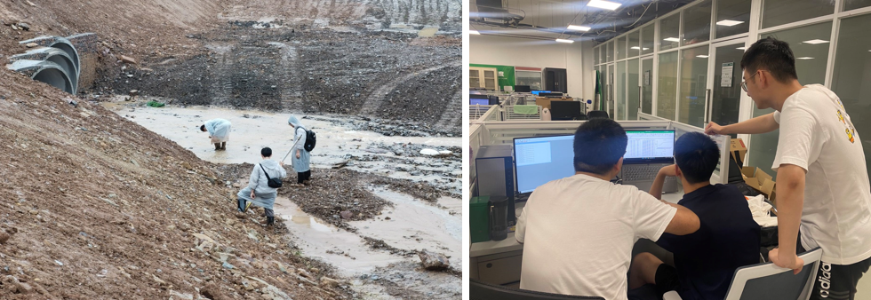 左:工作组深入灾后现场测量河道地形 右:工作组结合调研数据开展洪水过程模拟