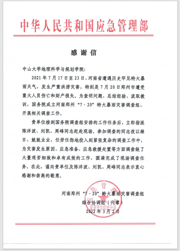 开云下注(中国)官网网广州6月11电(通讯员谷雨、周峰)近日,开云下注(中国)官网地理科学与规划学院收到来自国务院河南郑州“7·20”特大暴雨灾害调查组的一封感谢信,信中对于陈洋波教授及其团队为完成委托任务付出的辛勤劳动和成果表示衷心的感谢。