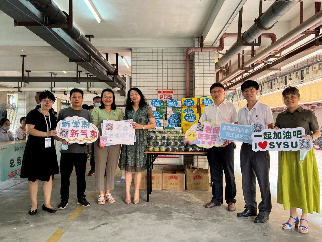 校工会兼职副主席、中山医学院党委书记张琪教授(左三),校工会委员李秀红教授(右三)“送清凉”慰问北校园迎新一线工作人员(来源:校工会)
