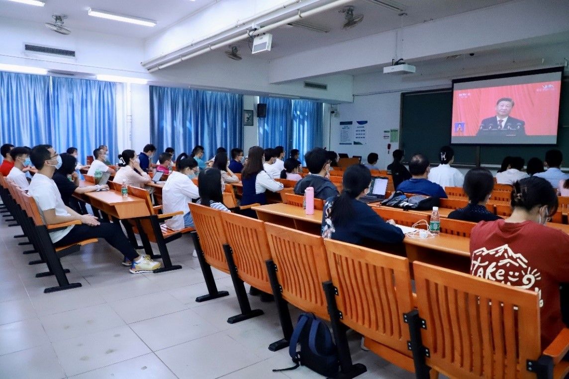 16日上午,广州校区南校园小礼堂,在校校领导和校长助理,机关部处负责人,师生代表共同聆听了习近平总书记的大会报告。会场内,大家通过屏幕深切感受到了人民大会堂内庄重热烈的现场氛围。