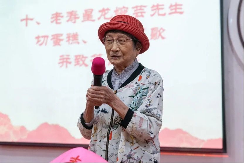 龙婉芸先生在典礼上感谢师生好友来参加这次活动,她将自己比作“一粒小芝麻”,做的工作似乎是“微不足道”的,收到学校、中文系和师生代表的祝福和贺礼感到很荣幸。走过百年,能够看到祖国从站起来到强起来,见证当今盛世,感到无比自豪。她祝福老朋友和青年朋友们能看得更远、更多,健康、快乐、长寿。