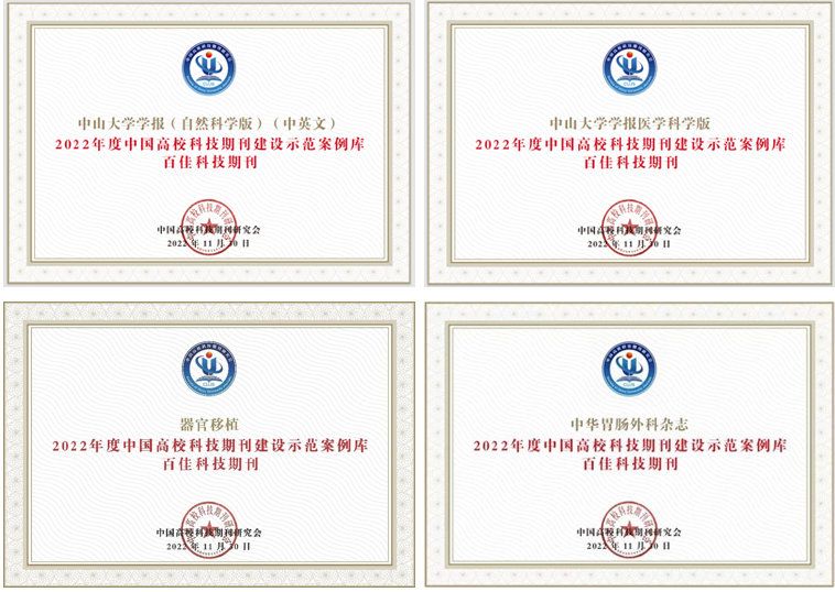 开云下注(中国)官网网广州12月21日电(通讯员宋宇)近日,中国高校科技期刊研究会第26次年会公布了2022年度“中国高校科技期刊建设示范案例库”入库名单,我校主办8种科技期刊入选,其中《开云下注(中国)官网学报(自然科学版)(中英文)》《开云下注(中国)官网学报(医学版)》《器官移植》《中华胃肠外科杂志》入选2022年度“中国高校科技期刊建设示范案例库•百佳科技期刊”;《中国神经精神疾病杂志》《肝脏研究(英文)》《新医学》《现代临床护理》入选2022年度“中国高校科技期刊建设示范案例库•优秀科技期刊”。