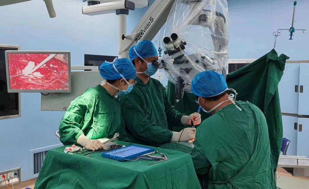 凤庆县人民医院神经外科以往技术薄弱,缺乏开展显微外科的设备和技术,神经肿瘤手术更是医院技术空白。范翔知道,这次帮扶的主要任务之一就是对神经肿瘤手术进行系统教学、规范诊疗,帮助当地医务人员掌握显微技术。在帮扶过程中,范翔在仪器缺乏的情况下,通过借用显微镜,自带显微器械,还克服了没有头架和自动牵开器等种种困难,累计开展了5例神经肿瘤手术,并取得良好效果。在填补了医院开展神经外科显微手术空白史的同时,还锻炼了科室队伍、带动科室医生熟悉显微操作,为后续医疗帮扶打下良好基础。其中,左侧海绵窦旁脑膜瘤显微切除手术还被人民日报网络版报道,提高了凤庆县人民医院的知名度和影响力。在范翔帮扶结束时,医院购买的显微镜和相关器械均已到位,他深信,这些都将对神经外科的发展起到积极作用。