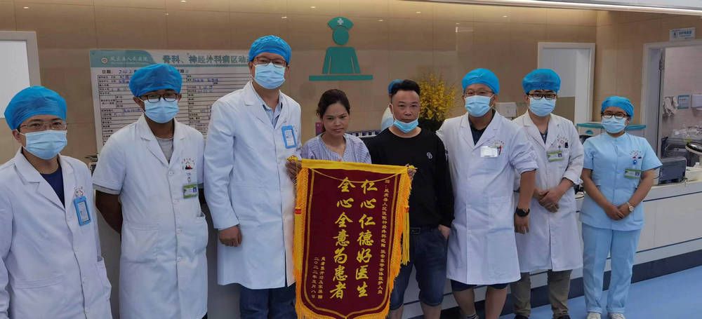 帮扶做的第一例肿瘤手术来自患者张女士,她因腰腿疼痛而入院,来院时已不能站立,只能曲腿躺着,检查发现是椎管内肿瘤,肿瘤已经完全占据了椎管空间,压迫脊髓神经,不治疗必然导致瘫痪。以前,这样的患者只能被介绍到昆明市里的大医院去做手术。但是当家属了解到帮扶的范翔主任是神经外科专家,经验丰富时,决定留在凤庆县人民医院。鉴于这是院内第一台神经肿瘤手术,范翔领导科室从肿瘤特性、手术要点、术中体位和术后恢复等各个方面做了全面准备。2022年4月30日,张女士在全麻下完成了腰1-2神经鞘瘤显微切除,手术只切除了肿瘤上下部分椎板,最大限度的维护脊椎稳定性,术后患者疼痛完全消失,出院时已可下地行走,家属非常感激,出院前特地制作了锦旗表示感谢。据了解张女士现在已经重归正常生活,还可以从事一定体力劳动。