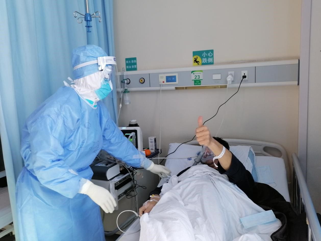 患者竖起了大拇指,感谢医疗队的悉心照料(左一为许可慰)