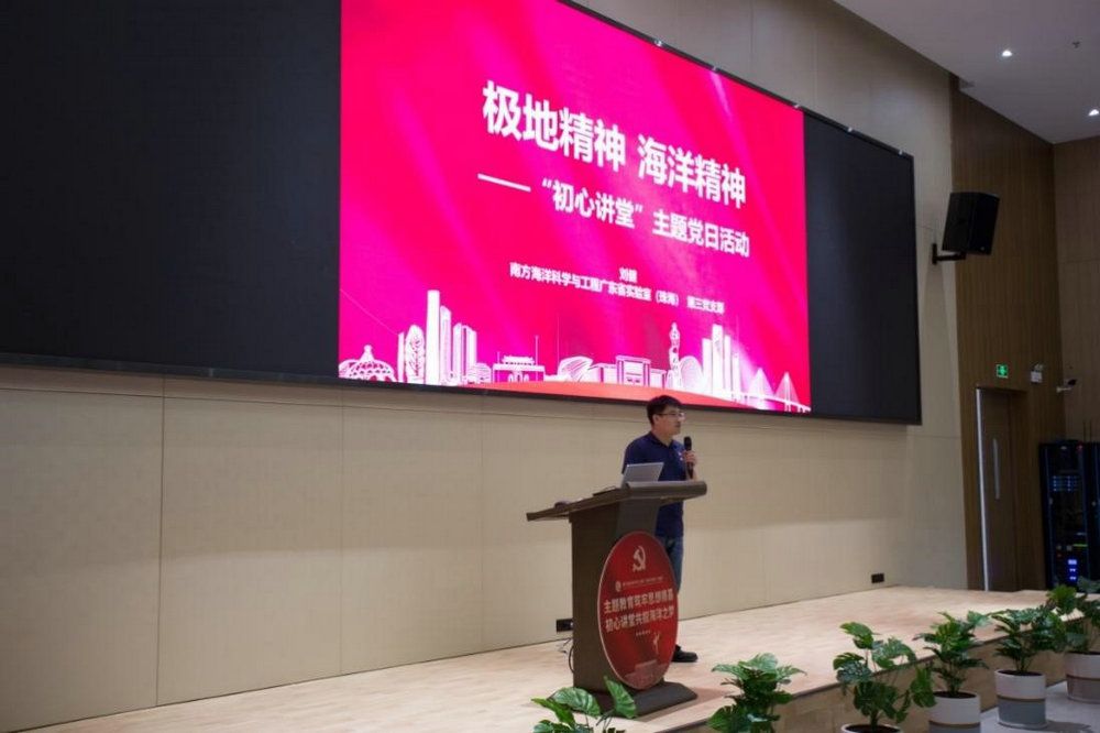 随后,各支部党员代表立足自身岗位,围绕“初心”“海洋梦”等活动主题,结合自身海洋工作经历,分享了各自的体会感悟。他们中有“勇斗风浪、恪尽职守”的海洋综合执法队员,有“与海结缘、逐梦深蓝”的青年学生,有“守国门、战疫情”的一线海关人,有“矢志强国、勇攀高峰”的大学教授,有“以笃行实干,守护碧海蓝天”的海洋生态预警监测调查人员,有践行并传承着“爱国、求实、创新、拼搏”极地精神的海洋科研人员。他们虽然岗位不同、经历不同,却用共同的心声,回答了同一个问题——如何在平凡的岗位中践行共产党员的初心和使命。南方海洋实验室第三党支部书记刘健以“极地精神、海洋精神”为主题分享了自身的海洋故事,表示在今后的工作中要具备源清流长的艰苦奋斗精神、海纳百川的开放包容精神、风雨与共的团结协作精神、凭栏观涛的求真务实精神以及勇闯天涯的开拓创新精神。