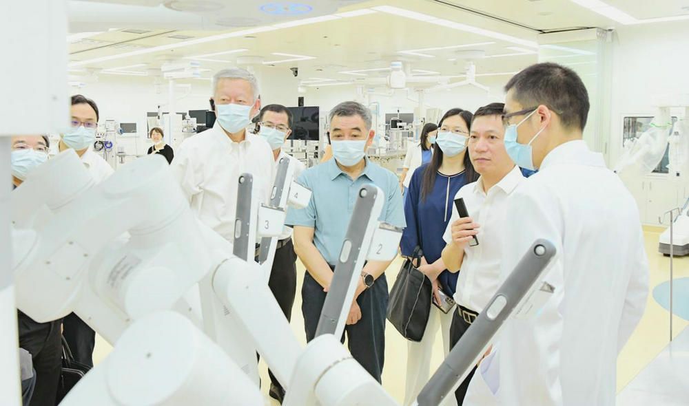 陈春声书记陪同指导组一行参观国际机器人手术培训中心(附属第一医院 刘星亮 摄)