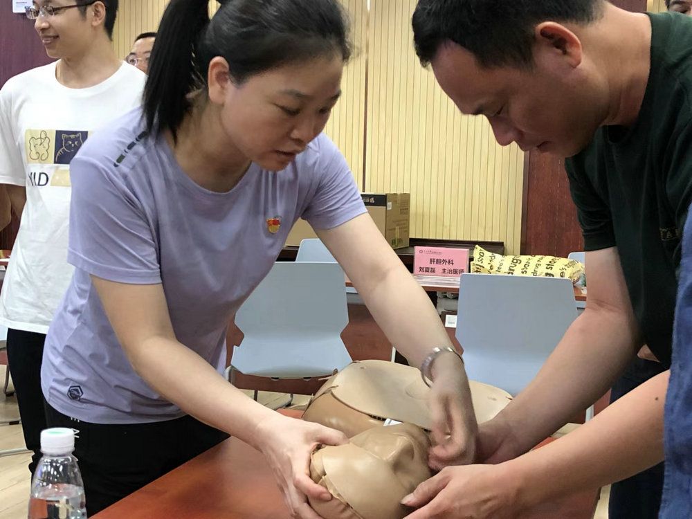活动现场,医院后勤教职工党支部党员进行消防安全讲座,详细讲解了家庭消防安全知识并示范了灭火器、防毒面具等自救设备的使用方法;行政教职工第二党支部党员讲解了正确的心肺复苏术、海姆立克手法和自动体外除颤仪(AED)急救仪器使用方法。