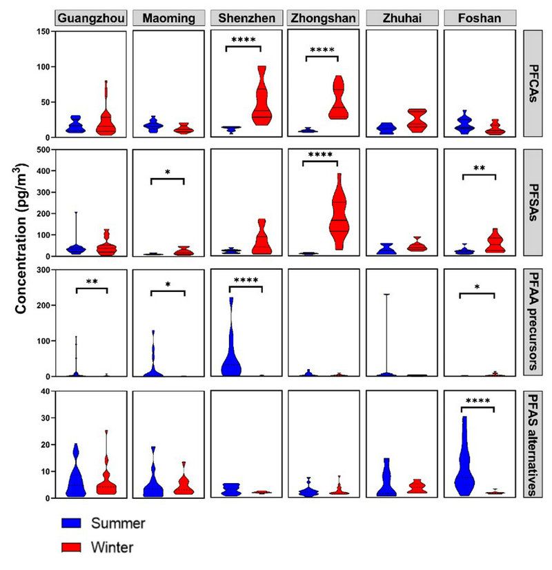 图2:珠三角6城市PM2.5中PFCA、PFSA、PFAA前体和PFAS替代品的浓度及其季节差异。