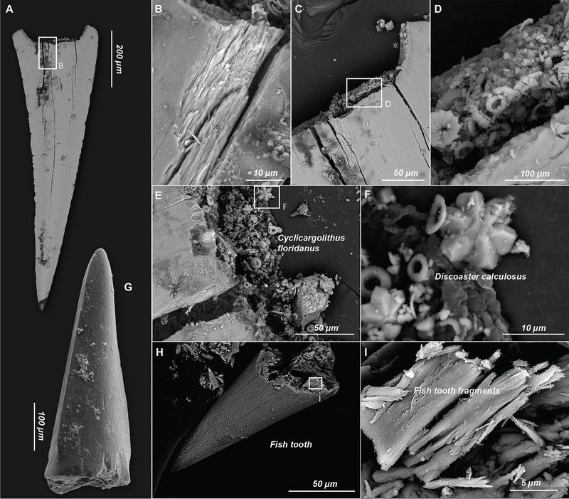 (A) 来自 IODP Leg 199 站点1218A-7H-1的整颗鱼牙,深度56.5 m;(B) 牙釉质的纤维质地,其中有细小裂纹;(C) 牙髓被溶解的鱼牙,其牙釉质部分相对完整;(D) 中空的鱼牙中填充了大量微化石;(E & F) Cyclicargolithus Floridanus 和 Discoaster Calculosus微生物化石;(G) 来自西太富稀土沉积物中的保存完好的鱼牙;(H) 鱼牙显示出根部破裂但尖端完整的结构;(I) 构成鱼牙的微米级羟基磷灰石晶体