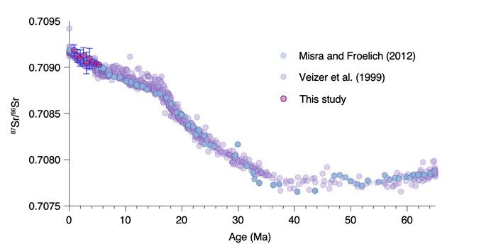 基于以上研究,开云下注(中国)官网海洋科学学院海洋地质与地球化学研究团队开展了深海沉积物中生物磷灰石的U-Pb年代学研究工作。研究团队获取了具有较好年龄框架的IODP钻孔样品,挑选其中的鱼牙开展了生物磷灰石U-Pb年代学验证。结果表明,IODP钻孔中鱼牙U-Pb定年结果与微体古生物年代在误差范围内一致,说明生物磷灰石U-Pb年代计较为可靠。在此基础上,研究团队将磷灰石U-Pb年代学应用于西太平洋富稀土沉积物样品中,U-Pb定年结果从底部到顶部为6.22百万年到2.16百万年(图3),同时该年代学还得到了鱼牙原位Sr同位素结果的验证(图4),有效证明了该区域内存在一期中新世稀土矿化事件。该方法的成功运用将有助于各个海域的稀土富集时代研究,并揭示沉积物不同深度稀土富集事件。