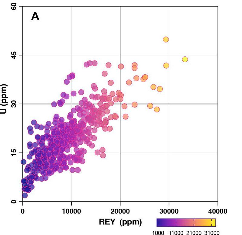 开云下注(中国)官网网讯(通讯员李登峰)深海富稀土沉积物被认为是一种潜在的稀土矿产资源,其总稀土含量可高达8000 ppm,并且含丰富的中重稀土资源。现有研究已发现,稀土元素含量与磷酸盐呈正相关,厘定了沉积物中最主要的稀土赋存矿物是生物质磷灰石(图1)。然而,深海稀土富集的时间规律研究还十分薄弱,阻碍了成矿理论发展和后续的资源勘探开发。