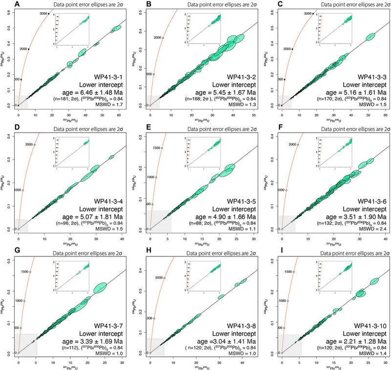 图3 西太平洋富稀土沉积物中鱼牙的U-Pb Wetherill谐和图,数据椭圆和年龄误差均为2σ