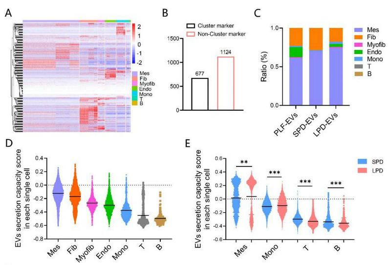 彭晖教授团队首先通过超速离心法分离了肾功能正常患者手术时的腹腔灌洗液,短期、长期腹膜透析患者腹透流出液来源的EVs,并对这些EVs进行无标记的4D LC-MS/MS蛋白组学测序。随后整合分析了EVs蛋白组数据和腹膜组织scRNA-seq数据,发现编码这些EVs蛋白的基因表达水平具有细胞类型特异性,通过多主体单细胞去卷积算法分析显示,间皮细胞是腹透流出液EVs的主要起源细胞。EVs起源细胞中,间皮细胞、成纤维细胞等实质细胞所占比例明显高于 T 淋巴细胞、B 淋巴细胞等免疫细胞。团队进一步在腹膜组织和腹透流出液脱落细胞的单细胞转录组数据中进行单样本基因集富集分析。结果发现,单个实质细胞,特别是间皮细胞和成纤维细胞,比其他腹膜细胞释放更多的EVs,并且长期腹膜透析刺激下的单个间皮细胞分泌更多的EVs(图1)。
