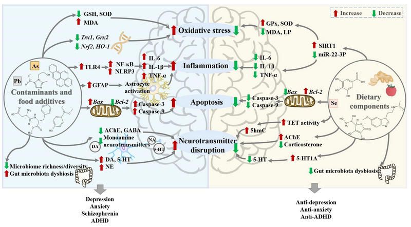 该文对多种污染物,如重金属(铅、砷)、有机污染物(多氯联苯、多环芳烃和苯并芘)、抗生素(米诺环素、环丙沙星、甲硝唑)、农药(氯氰菊酯、敌敌畏和氯氰菊酯),及食品添加剂,如阿斯巴甜、对羟基苯甲酸酯、聚山梨醇酯和味精等,进行了总结。阐述了污染物及食品添加剂会增加精神障碍的风险,例如抑郁症、焦虑症、精神分裂症、注意力缺陷多动障碍。另一方面,一些天然膳食产物,如苹果提取物、抗坏血酸、没食子酸、褪黑素、姜黄素和益生菌等能够防治污染物和食品添加剂引发的心理疾病,该文强调了污染物和食品添加剂对心理健康的影响,而不是传统上认为的对机体健康的影响。